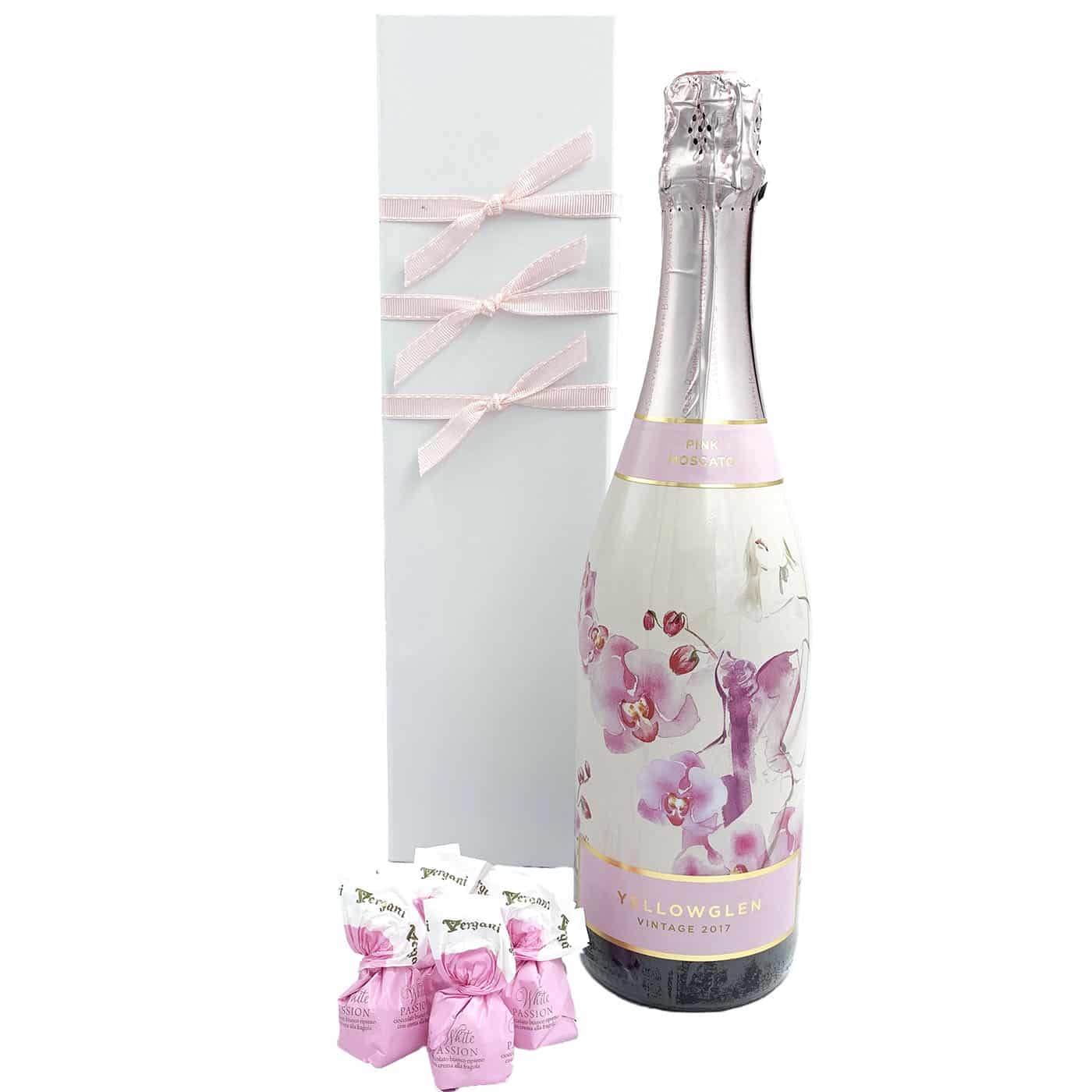 Pink Moscato Princess Gift Hamper. Moscato dAsti Italy 750ml. Delectable Fardoulis milk chocolate truffles accompanied with a bottle of Audrey Wilkinson Moscato 750ml.
